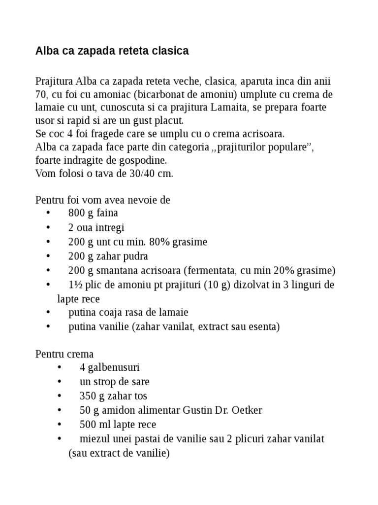 Alba ca zapada insa nu despre cunoscutul film de desene animate marca walt disney ci despre prajitura alba ca zapada, a carei reteta vine din timpuri ceva mai indepartate alba ca zapada. Prajitura alba ca zapada reteta veche, clasica, cu foi cu amoniac (amoniu) umplute cu crema de lamaie cu unt.